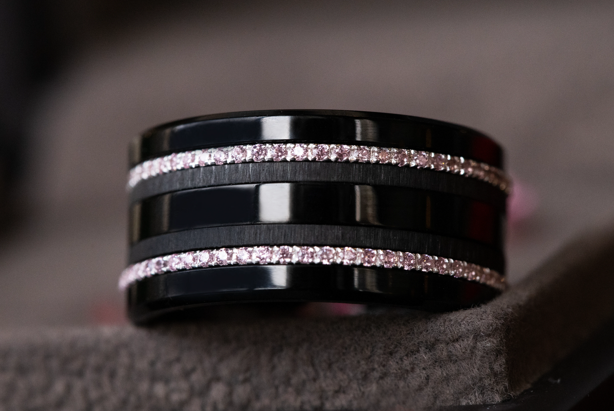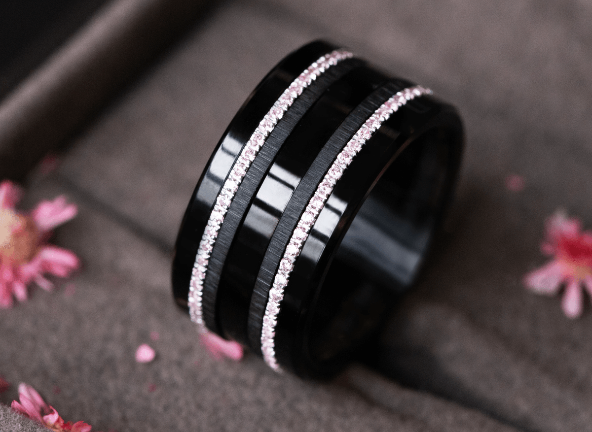 L’association de l’acier poli, lisse et lumineux, avec l’acier froissé black, plus brut et texturé, crée un jeu de matière riche et sophistiqué. Les minis Aura Sakura viennent adoucir l’ensemble avec une touche florale délicate, apportant lumière et équilibre à cette composition profonde.