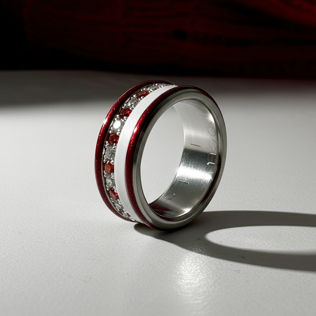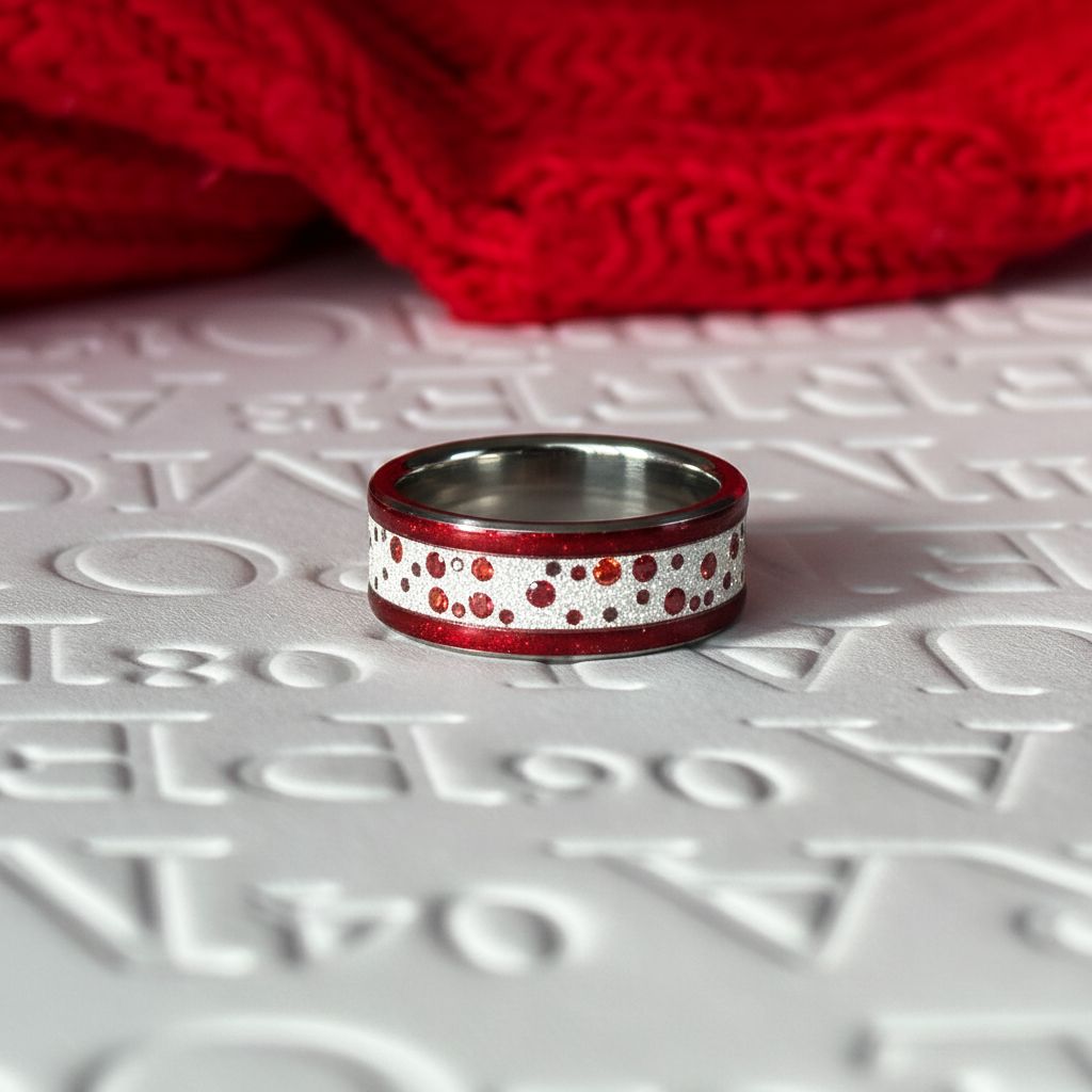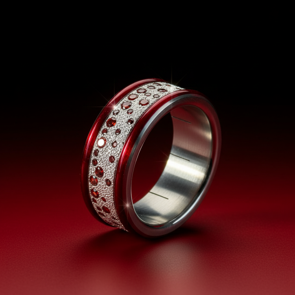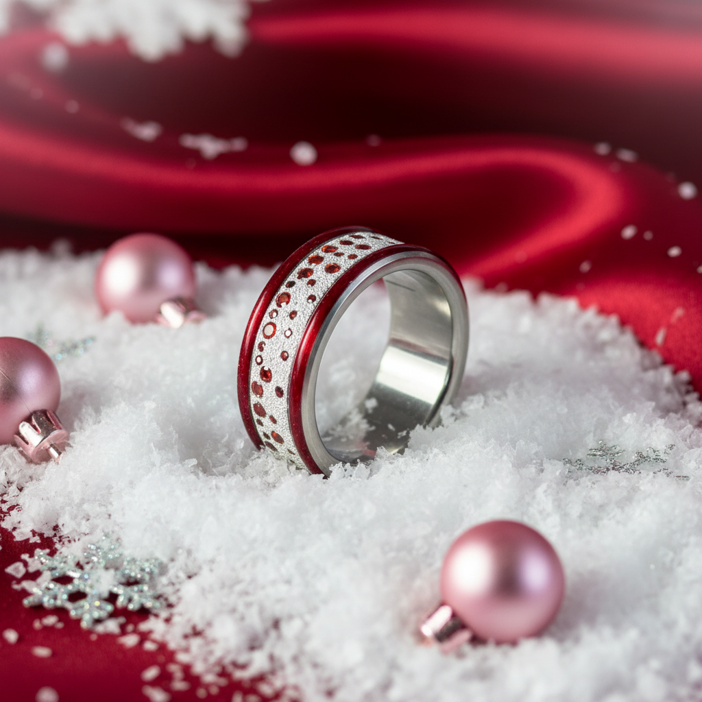 Son rouge profond, relevé d’une pluie d’étincelles, reflète la lumière comme une guirlande scintillante autour d’un souvenir précieux.