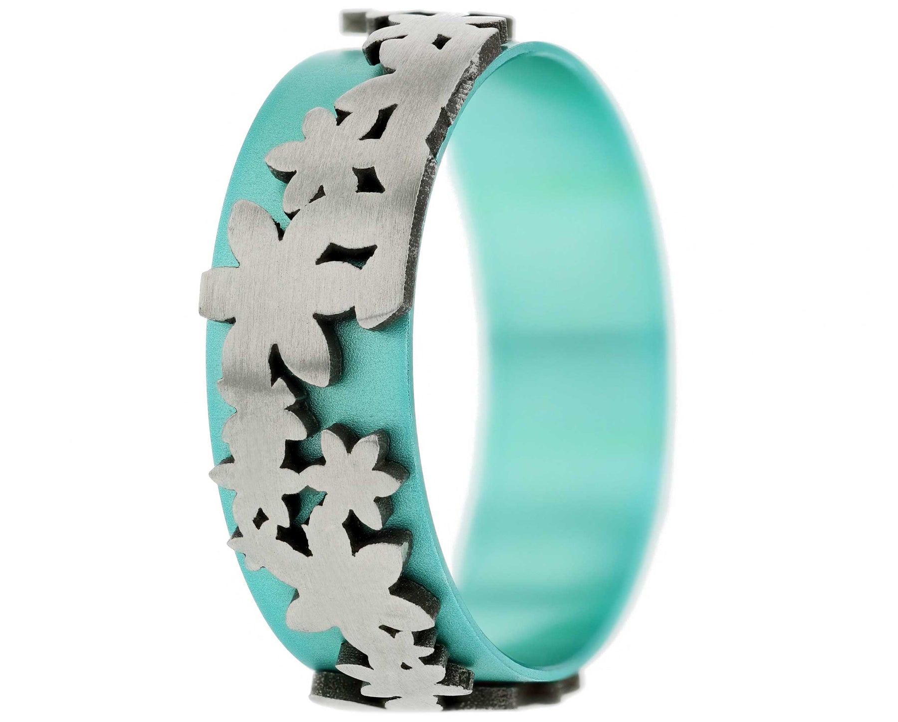 Der Teil aus Aluminium ist der auswechselbare Teil dieses Schmuckstücks. Die Farbe kann je nach Lust und Laune ausgetauscht werden. Für diese erste Ausgabe haben Sie die Wahl zwischen drei Farben: Aubergine, Türkis oder Rot.