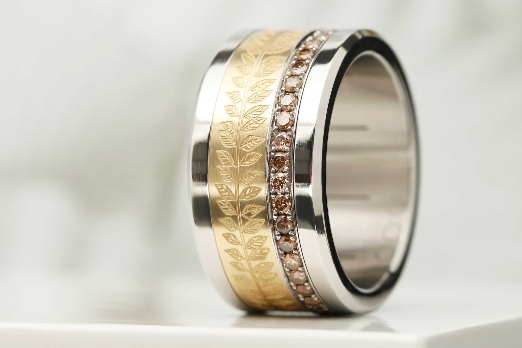 Ce coffret d'été comprend un medium entièrement serti de diamants bruns 1.6mm, un deux tiers en or jaune 9k "Flash Grèce". Une base small en acier inoxydable, polie (11mm) pourra être ajoutée à votre coffret selon votre choix.