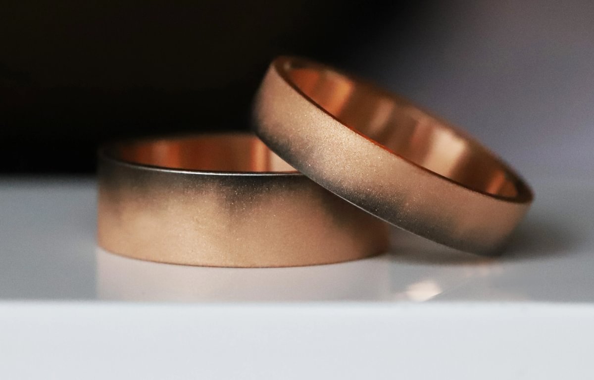 Ein sandgestrahltes Design in zartem, tiefem Rosa, das wie eine lebendige Oberfläche wirkt: Jede Maserung fängt das Licht zart ein... bis unter der Beschichtung der rohe Glanz des rosafarbenen Edelstahls in Abstufungen zum Vorschein kommt.