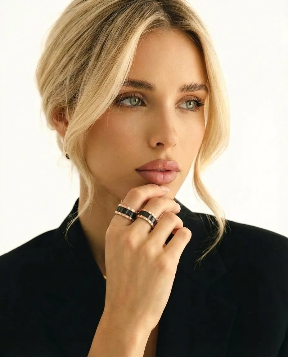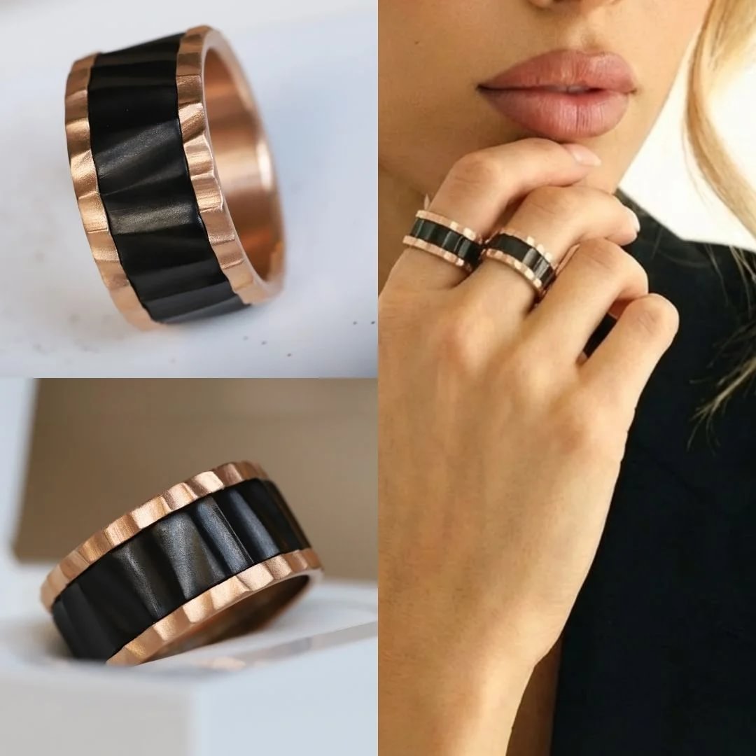 Lâalliance du rose gold lumineux et du black profond crĂ©e une tension Ă©lĂ©gante et magnĂ©tique. La chaleur solaire dialogue avec lâintensitĂ© de lâombre, rĂ©vĂ©lant une esthĂ©tique audacieuse et sophistiquĂ©e, oĂč la douceur mĂ©tallique rencontre un caractĂšre affirmĂ©.