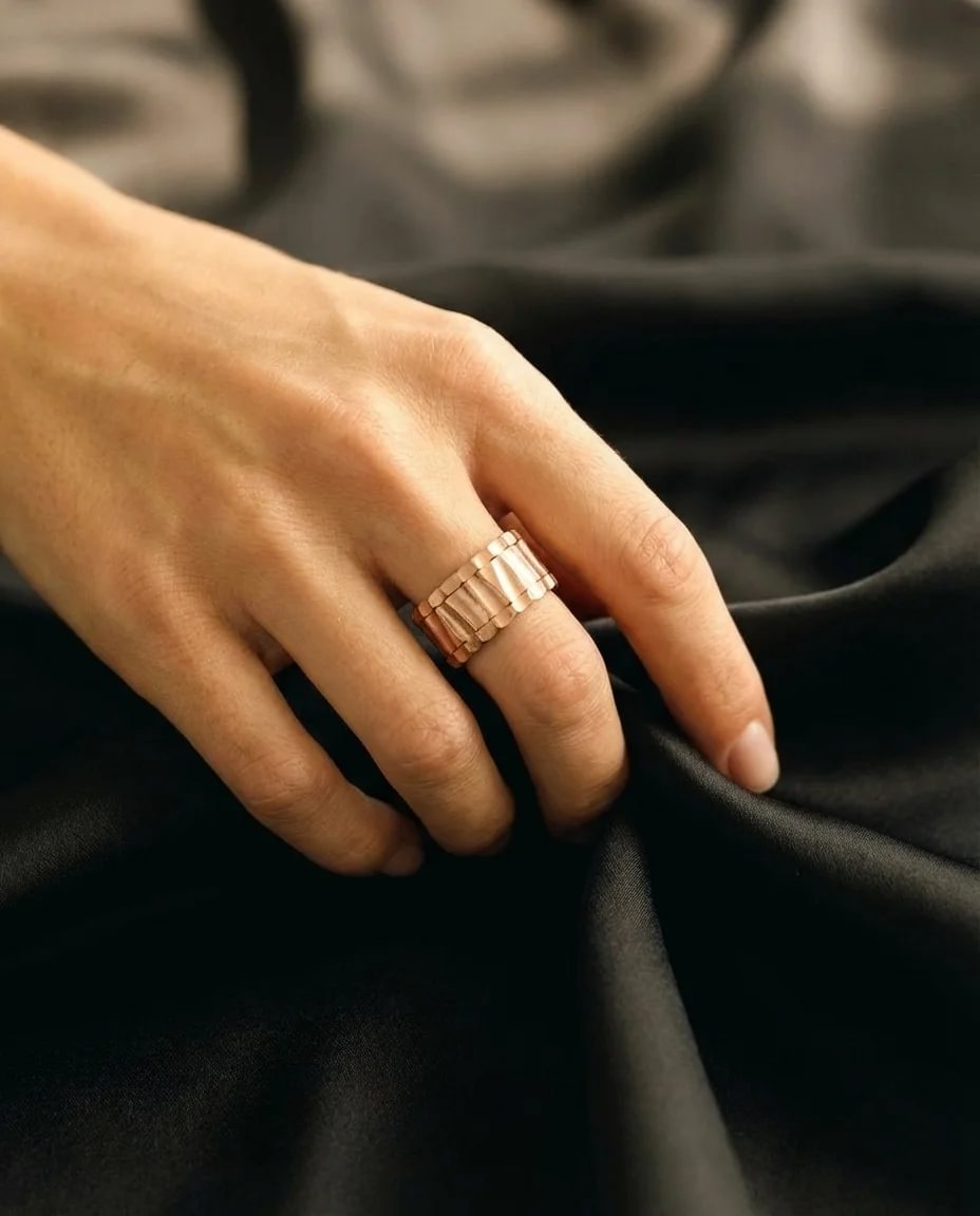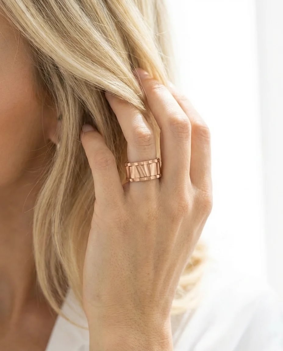 Le rose gold apporte une chaleur subtile, presque solaire, qui dialogue avec la force minĂ©rale de lâacier travaillĂ©. Une esthĂ©tique Ă©quilibrĂ©e, oĂč la douceur rencontre le caractĂšre, et oĂč la fĂ©minitĂ© sâexprime avec puissance et modernitĂ©.