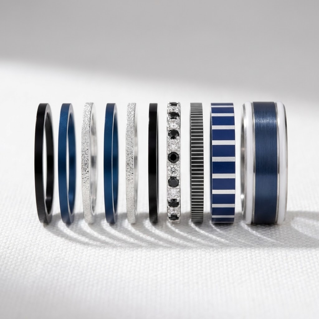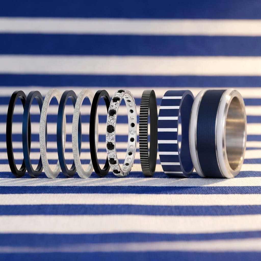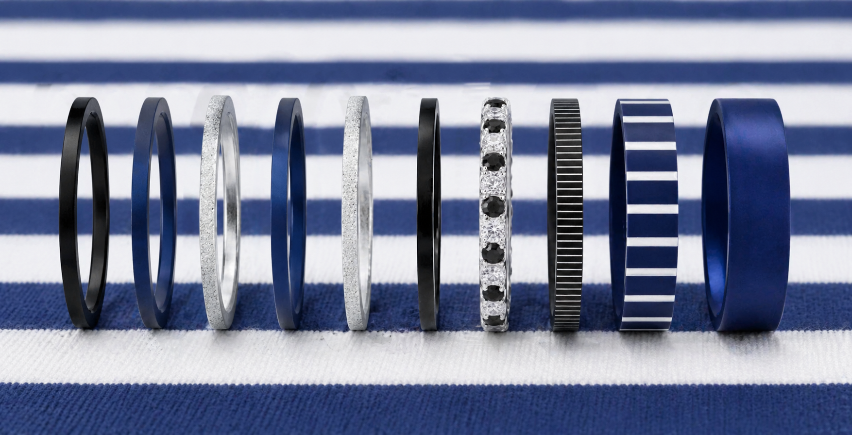 Mit dem starken Kontrast des schwarzen Edestahls, der Frische des Marineblau, dem reinen silbernen Glanz des „Ewigen Schnee“ und dem charakteristischen Streifenmuster der Matrosenbluse strahlt dieses Set eine natürliche, mühelose Eleganz aus.