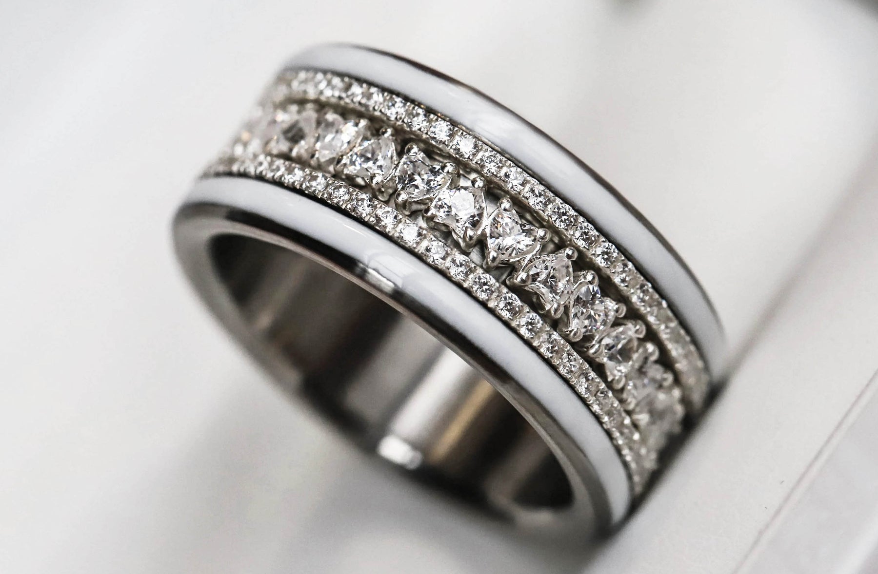 The gems, pure white and luminous, capture the light with finesse and reveal a crystalline sparkle, symbolizing sincere love, clarity, and pure emotion. The sequence of hearts creates an elegant visual harmony, the refined signature of this piece that is both romantic and contemporary.