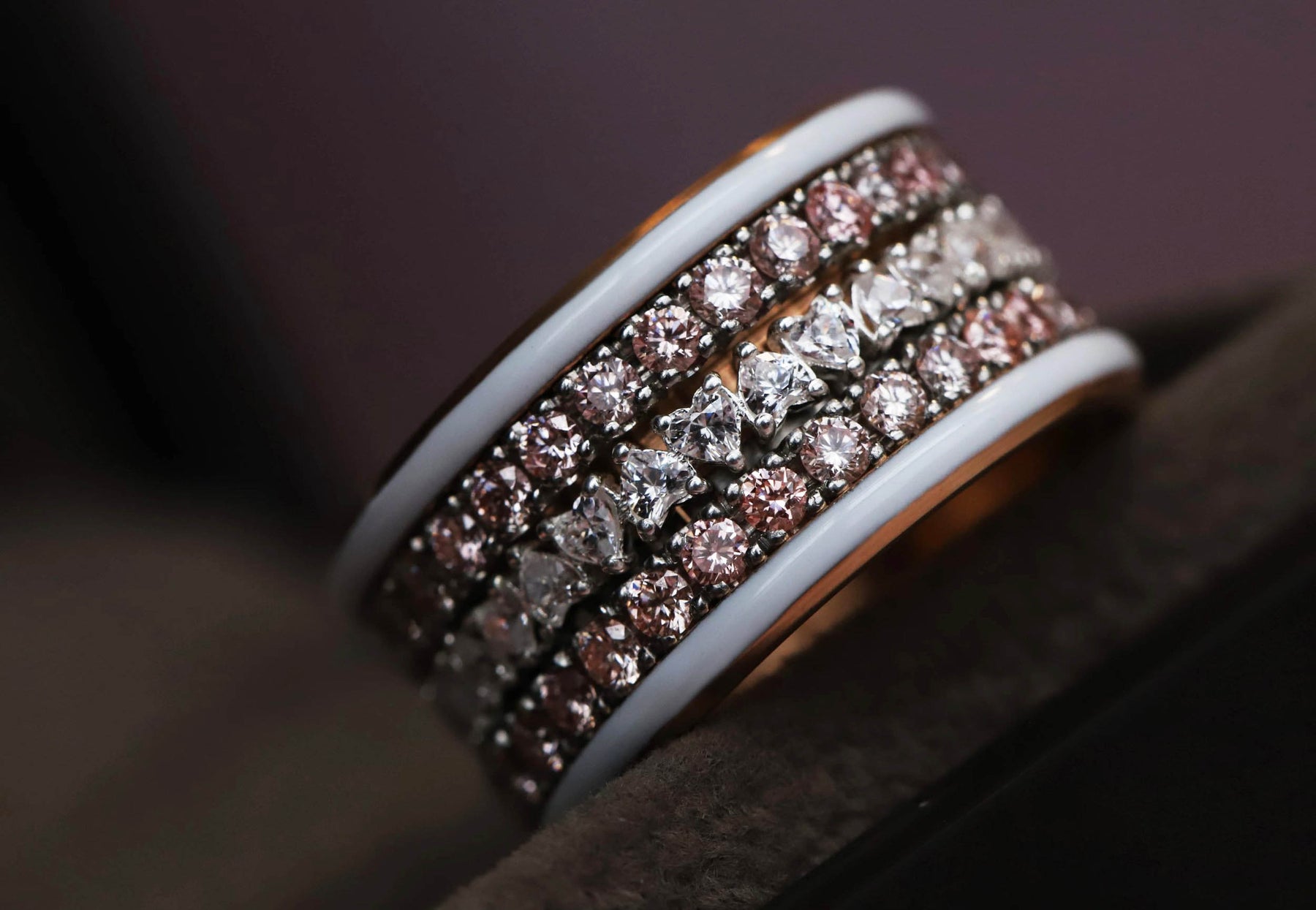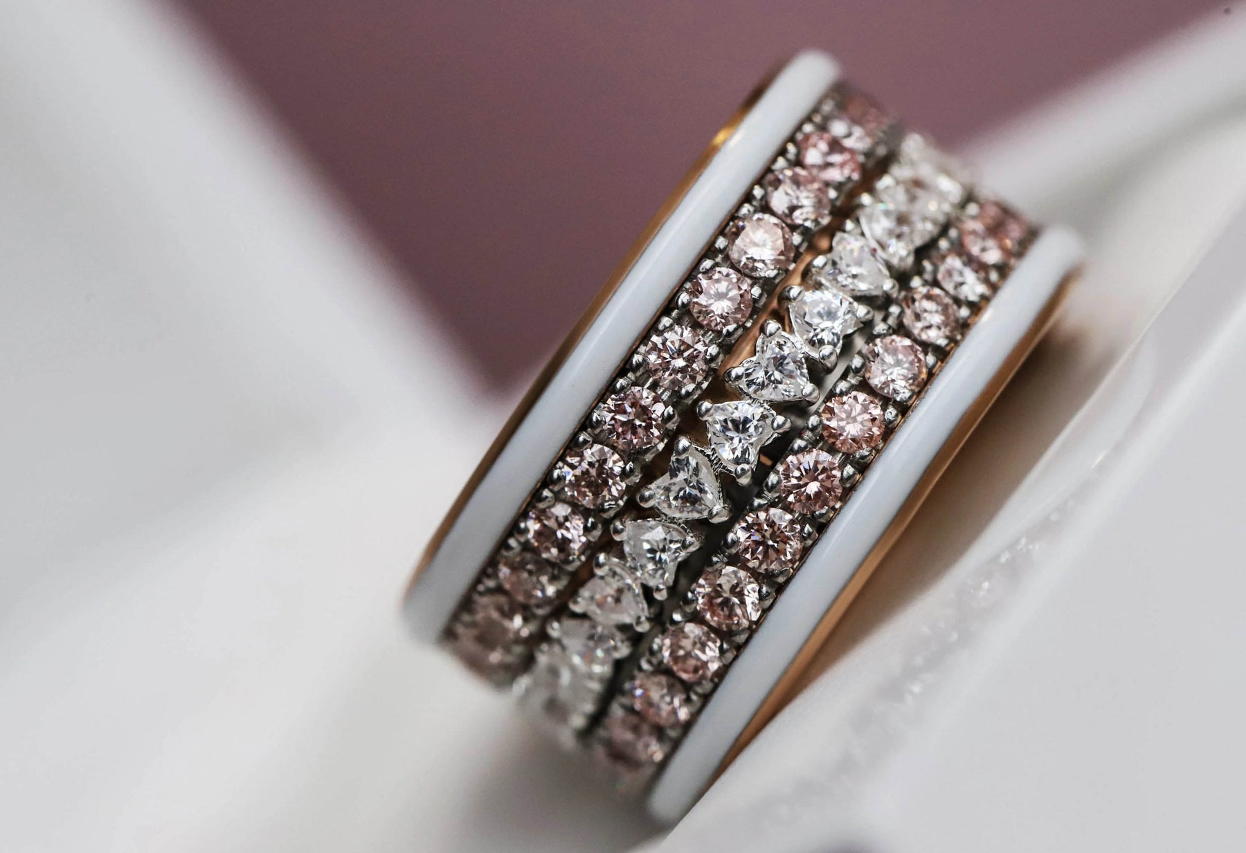 Super composition sur ma base Xs carrée sertie de 2 saphirs rose et 3 diamants accompagnée d’un médium émail tulipe
