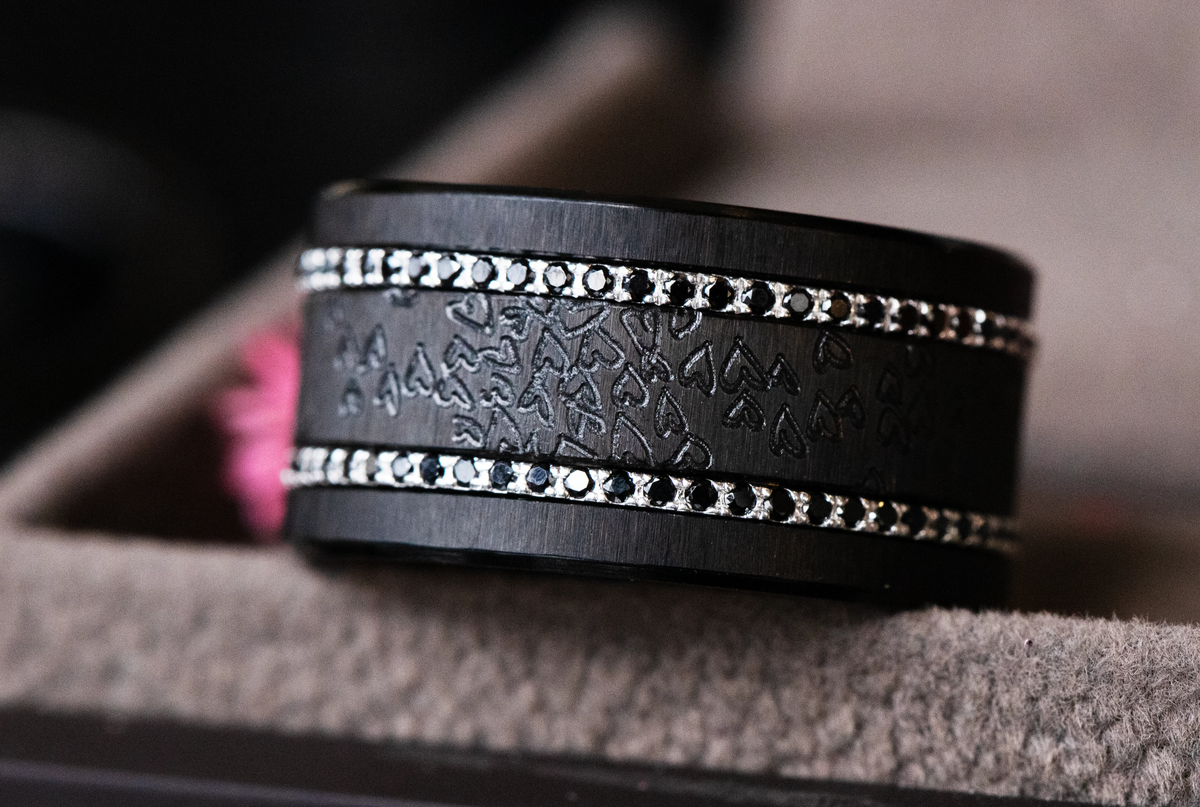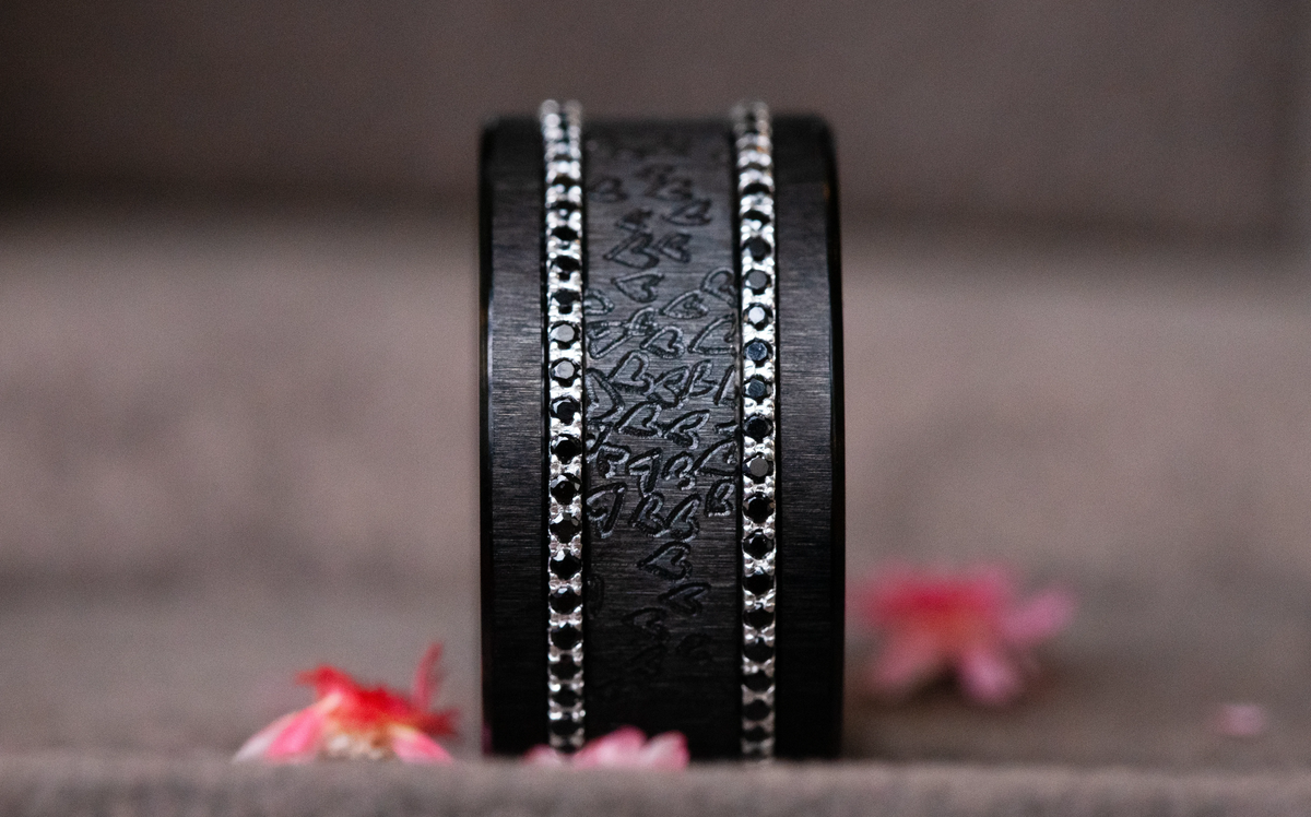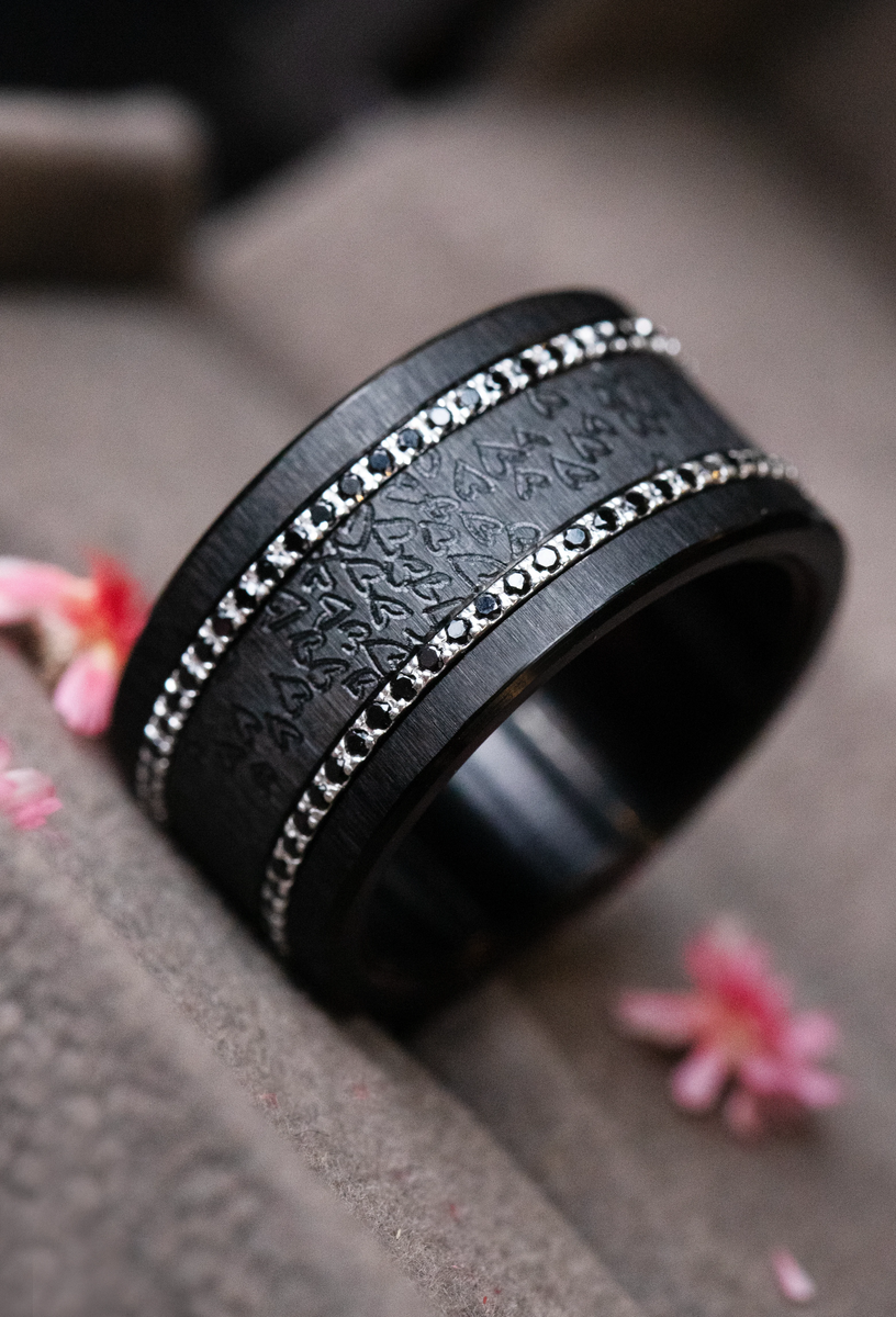 La profondeur de l’acier froissé black, associée aux nuances sombres des Aura Obscura, crée une composition intense et élégante. Le deux tiers Amour Infini vient apporter une dimension symbolique forte, comme un fil conducteur au cœur de cette obscurité lumineuse.