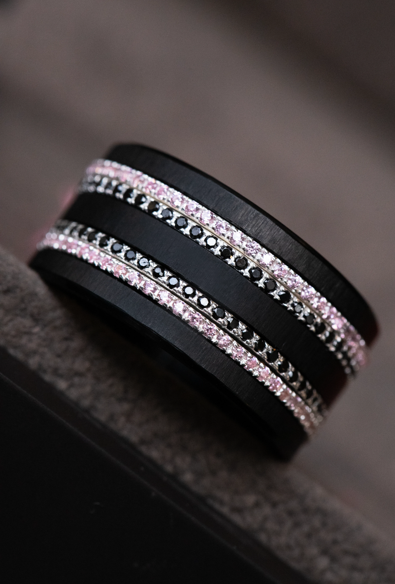 L’association des Aura Sakura, lumineux et délicats, avec les Aura Obscura, plus profonds, crée un jeu de contrastes subtil et captivant. Le medium en acier froissé black vient structurer la composition avec force, apportant texture et caractère à l’ensemble.